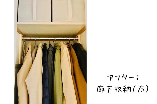 我が家の廊下収納の奥行の深い方は、試行錯誤の末、最終的に、家族のコートクローゼットになりました。
